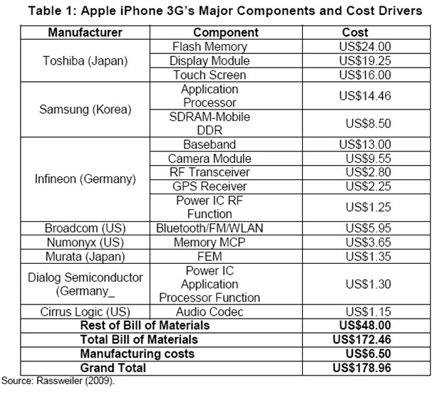 La mayor parte de los componentes son fabricados en Japón, Corea y Alemania. El coste de fabricación es de 6.50$ y el de producción final 178.96$. Así esta estrategia de producir en China lleva a incrementar el déficit comercial de los EE.UU, y aumentar los márgenes de beneficios de Apple alcanzando en el 2009 un 64% en cada iPhone.