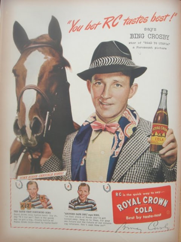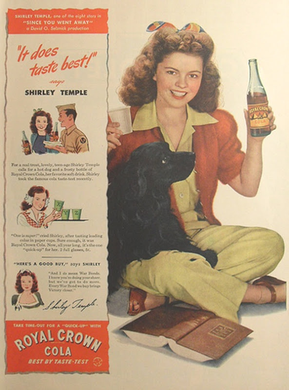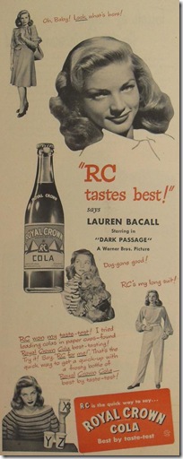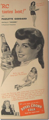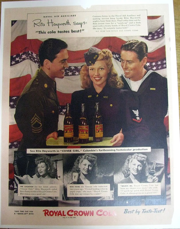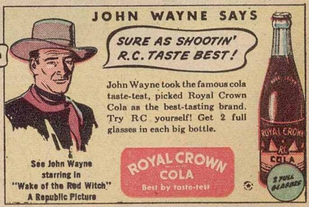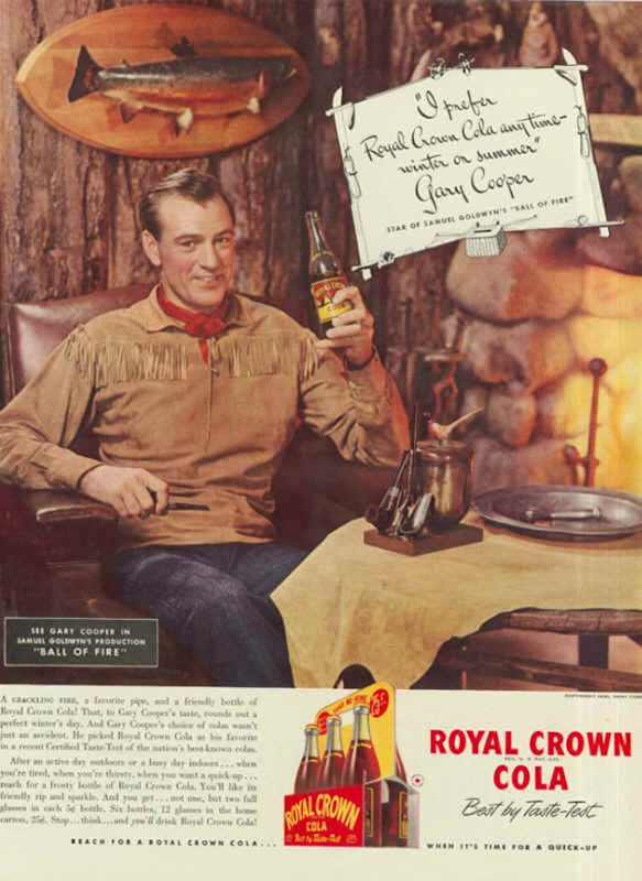 Mantenerse en un mercado dominado por los dos grandes supongo que hace despertar la imaginación y muchos antes que lo hiciera Pepsi en los años 70, Royal Crown introdujo en su publicidad el método “Best by taste test” o los test ciegos de refrescos de cola en el año 1941, utilizando para las pruebas ciegas a las más importantes celebridades del cine. Estrellas como Lucille Ball, Loretta Young, Joan Crawford, Lauren Bacall, Shirley Temple, Barbara Stanwyck, Hedy Lammar entre otras muchas fueron participes de la campaña. Entre los actores cabe destacar a Gary Cooper, Bing Crosby, Bob Hope y Jhon Wayne. Esta espectacular campaña supuso vincular a Royal Crown Cola como la bebida por excelencia de las estrellas del cine. “RC tastes best” fue el eslogan de la campaña y sus principales soportes la prensa escrita y la radio. A sus competidores no les gusto como es natural pero siempre conto con el agrado del publico, lo que hizo que se mantuviera durante mas de una década como la única campaña publicitaria de la compañía.